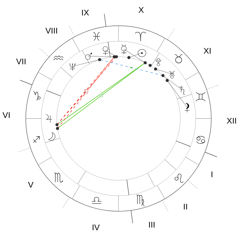 Его Медиум Коэли стоит в Скорпионе. Публичная судьба была отмечена интенсивностью, кризисами и трансформацией. Моррисон умер в двадцать семь лет в Париже — в уединении, далеко от тех, кто знал его по сцене. Двенадцатый дом завершил свою работу буквально.